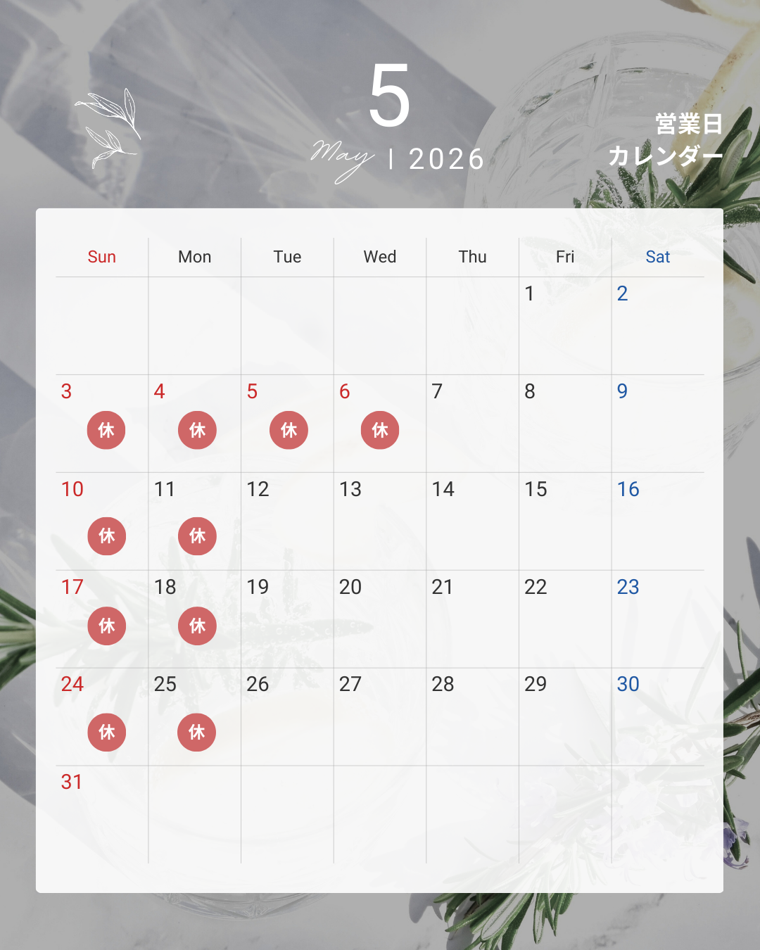 3月〜5月の営業カレンダーアップしました♪